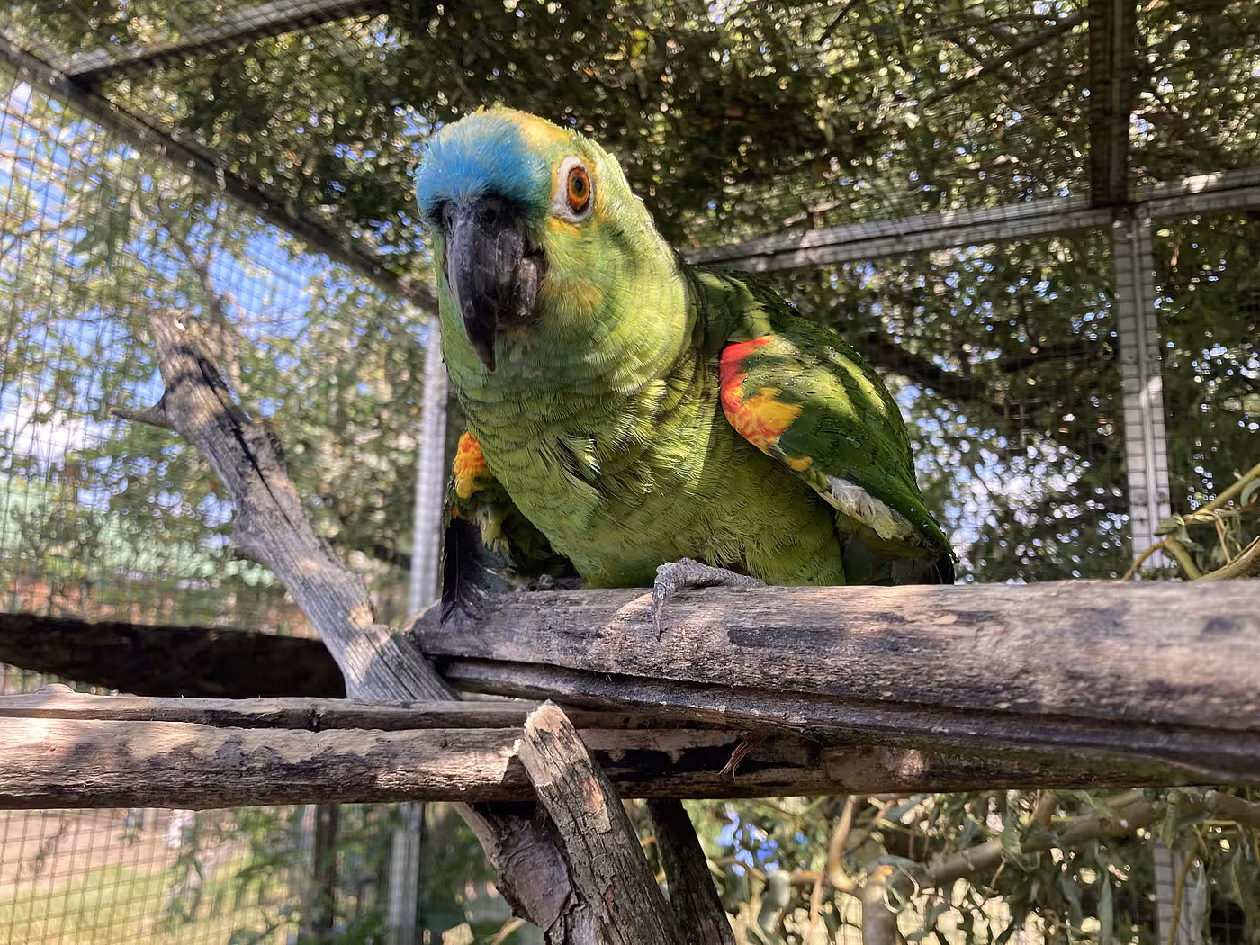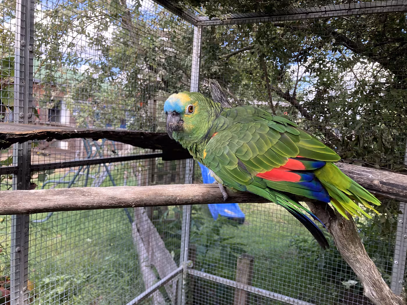 Aufgrund einer Verletzung fehlen unserer Lore am linken Fuß einige Zehen, weshalb sie sich nur schlecht auf einem Ast halten kann. Auch die Versuche auf der Schulter der Kollegen zu sitzen misslingt ihr, was sie jedoch nicht davon abhält es dennoch hin und wieder zu versuchen. Fliegen kann unsere dienstälteste Amazone noch und naschen vom Obst, Gemüse und Nüssen lässt sie sich auch nicht nehmen.