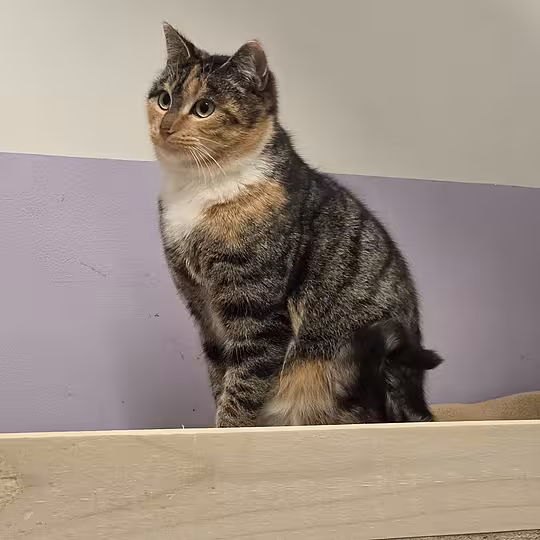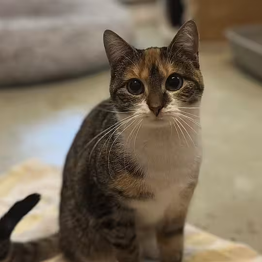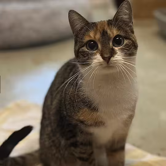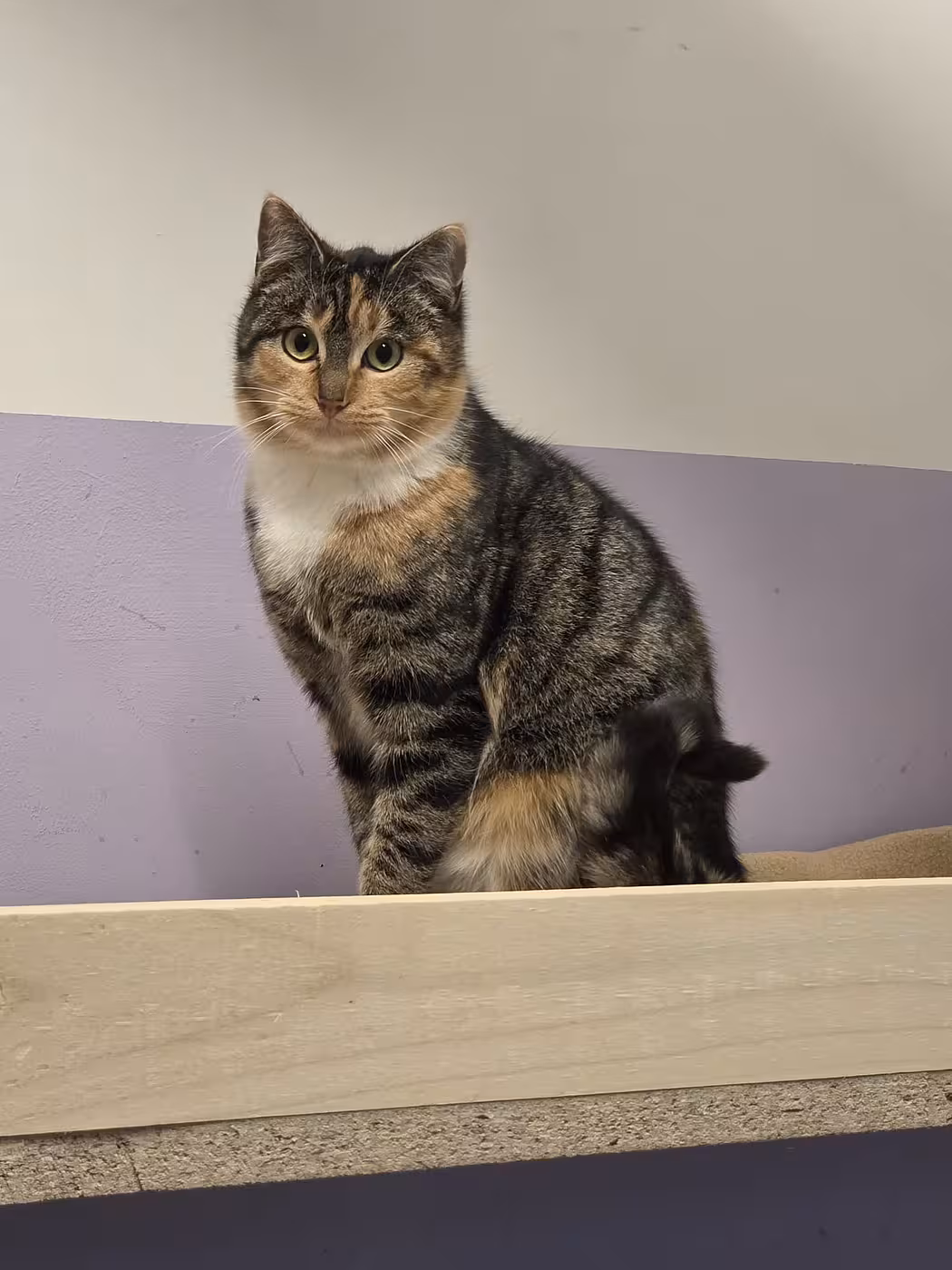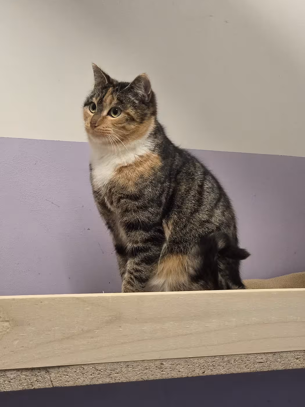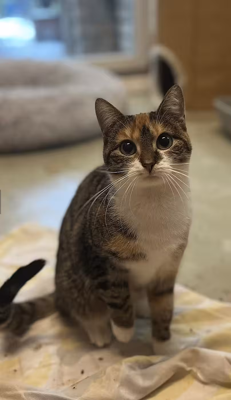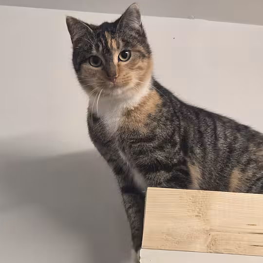 Chloè kam 2025 mit 3 kleinen Kätzchen zu uns. Sie hatte also erst noch eine Mamarolle, bevor sie in die vermittlung konnte. Desweiteren ist Chloè anfangs noch sehr ängstlich gegenüber Menschen. Das ist auch immer noch so , anfassen ist noch nicht so ihr Ding- allerdings ist chloè sehr neugierig und wie man auf den fotos sieht, die Kamera ist zwar gruselig aber doch irgendwie spannend.