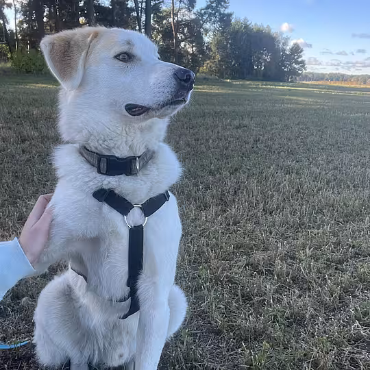 Herdenschutzhundtypisch bringt Dotty in bestimmten Situationen noch Verhaltensweisen mit, die begleitet werden sollten – z. B. beim Spaziergang an der Leine oder bei Besuch. Mit Geduld, Training und liebevoller Konsequenz kann er hier aber gut lernen.