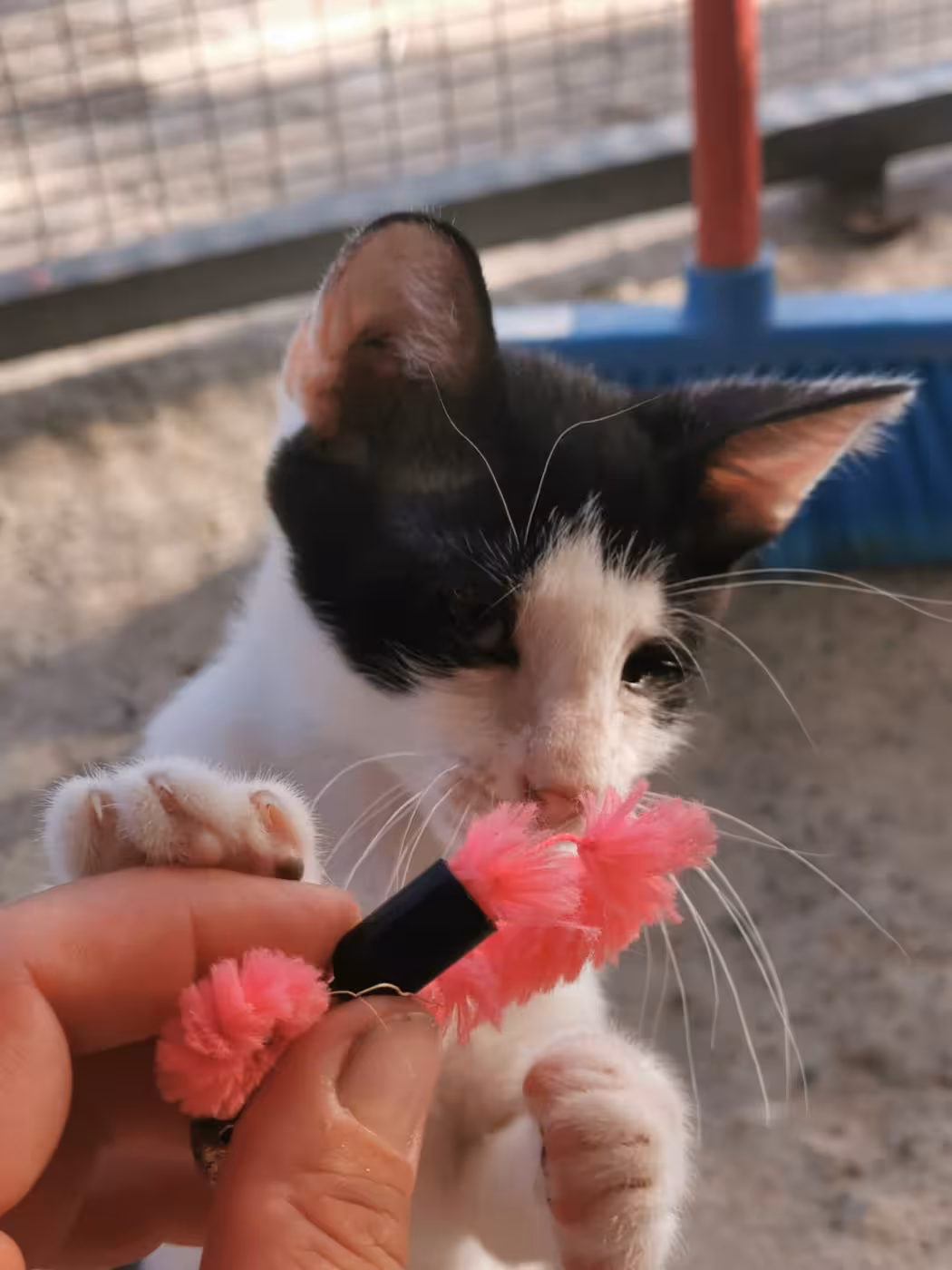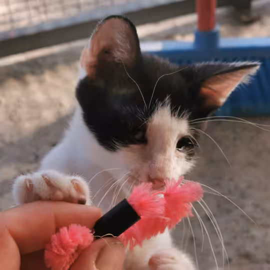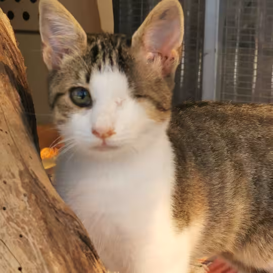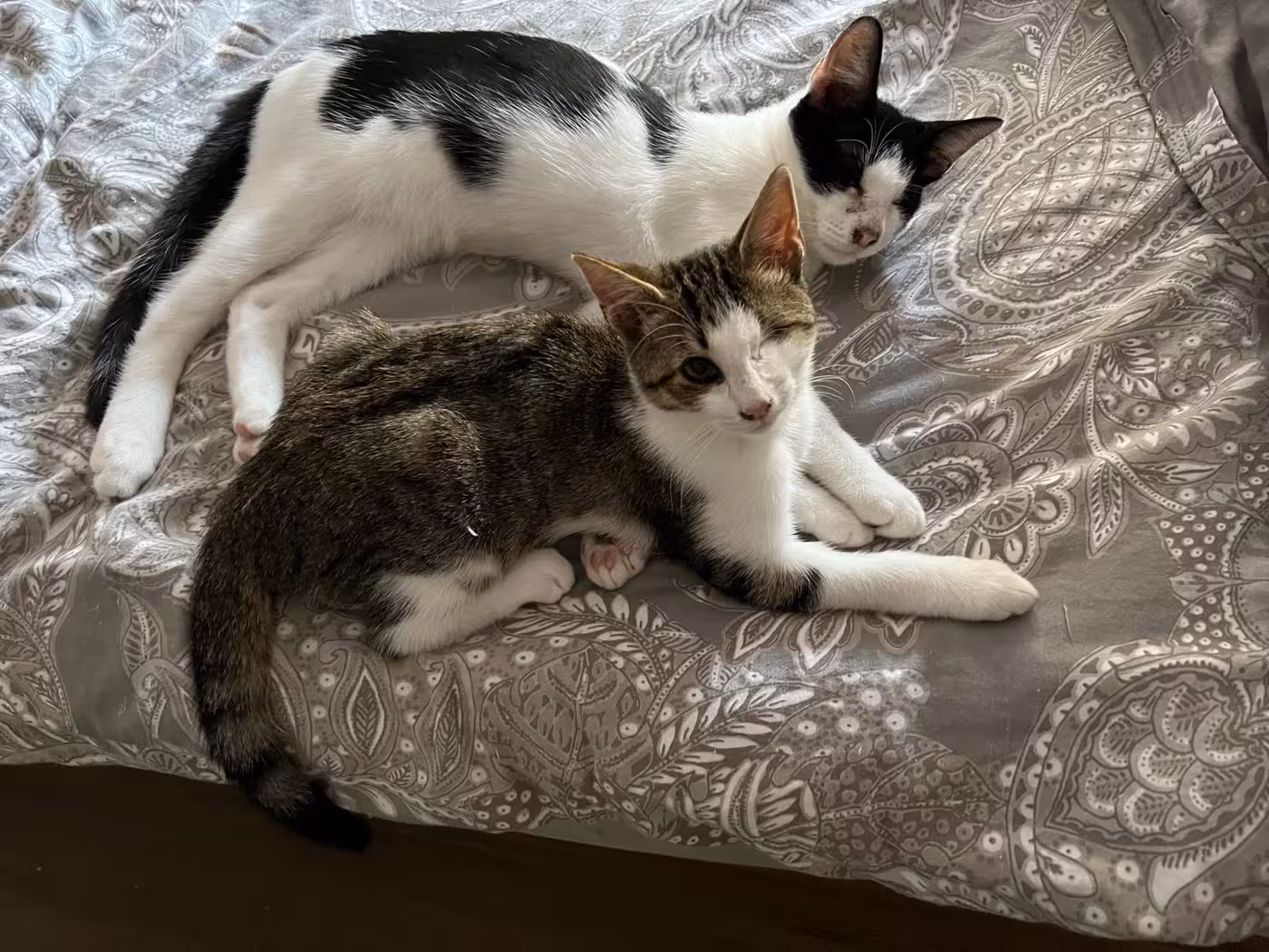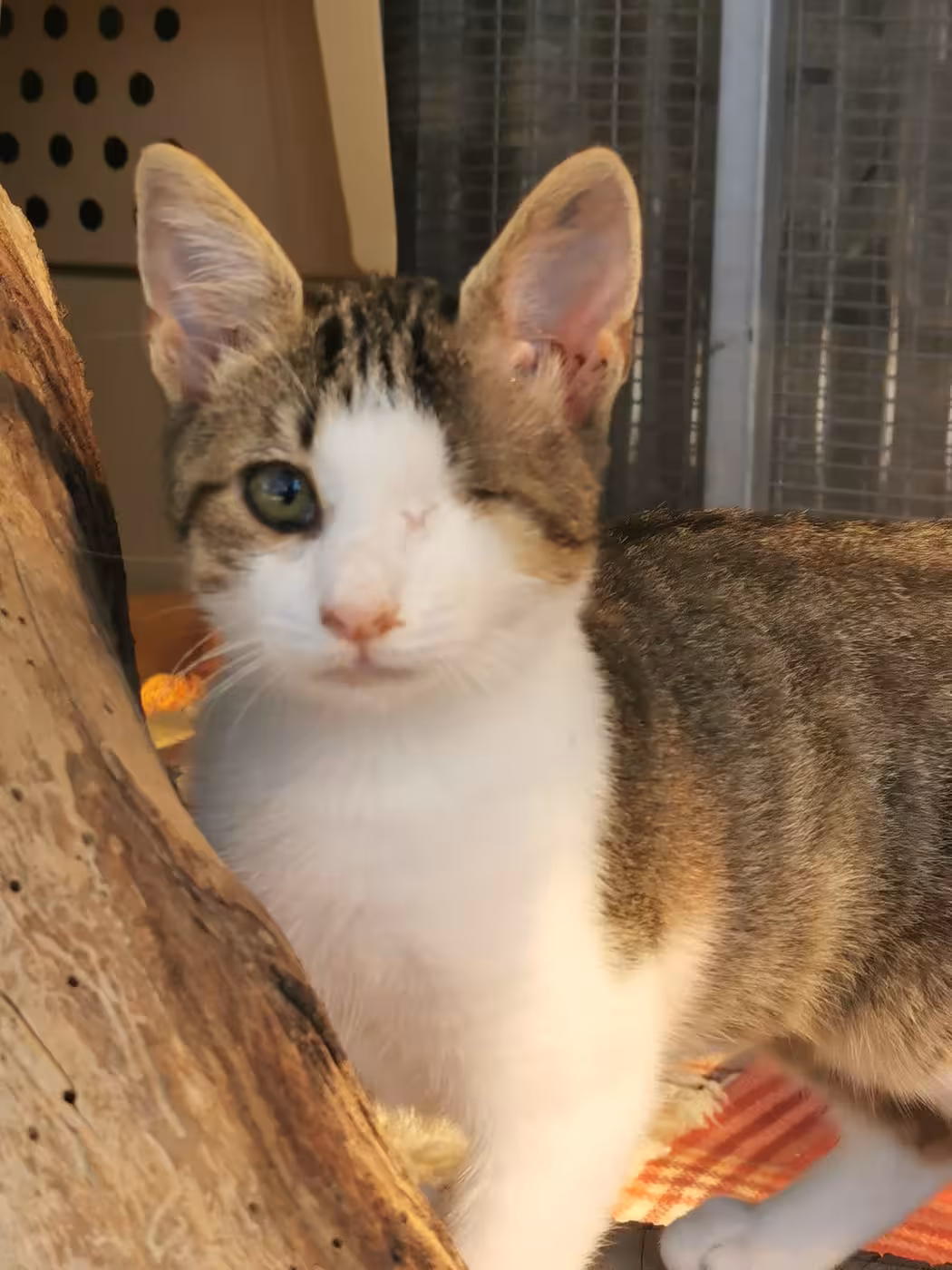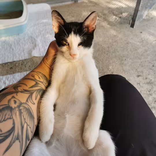 Die zwei zuckersüßen, Anfang Mai geborenen Katzenkinder haben leider einen schweren Start gehabt. Über eine Tierschützerin wurden sie zu einer unserer Kampagnen auf Kreta gebracht. Zwei ganz kleine Wesen, die total verschnupft mit schlimm verklebten Augen, voller Flöhe und abgemagert waren. Irgendwo ausgesetzt wurden sie einfach sich selbst überlassen, sodass das 3. Geschwisterchen im Bunde es leider nicht schaffte. Unsere Kollegen kümmerten sich voller Hingabe um sie, behandelten sie und zogen sie mit der Flasche groß. Leider konnte jeweils ein Auge bei beiden nicht gerettet werden, da die Beschädigungen durch den Katzenschnupfen einfach zu gravierend waren. Jedoch kommen sie mit ihrem einen Auge ganz hervorragend zurecht. Man sollte damit rechnen, dass sie vielleicht ab und an mal ein paar Augentropfen brauchen, da auch die verbliebenen Augen einfach heftig dem Katzenschnupfen ausgesetzt waren. Das ist aber nicht schlimm und machen sie prima mit - wenn es dann mal nötig sein sollte. Gesundheitlich sind sie nun ganz fit.