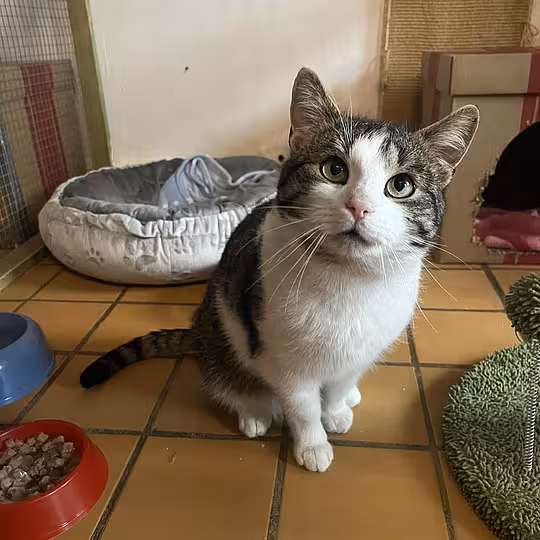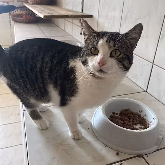 Ich bin ein weiß-grauer, kastrierter Hauskater und wurde ungefähr am 01.06.2025 geboren. Im Januar 2026 wurde ich in Forst gefunden und als Fundkatze ins Tierheim gebracht.
