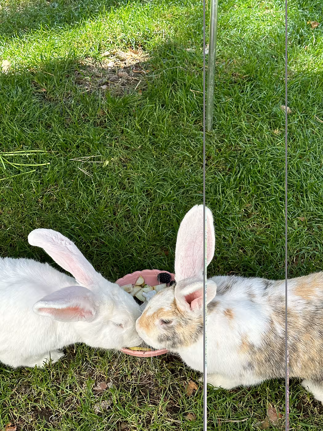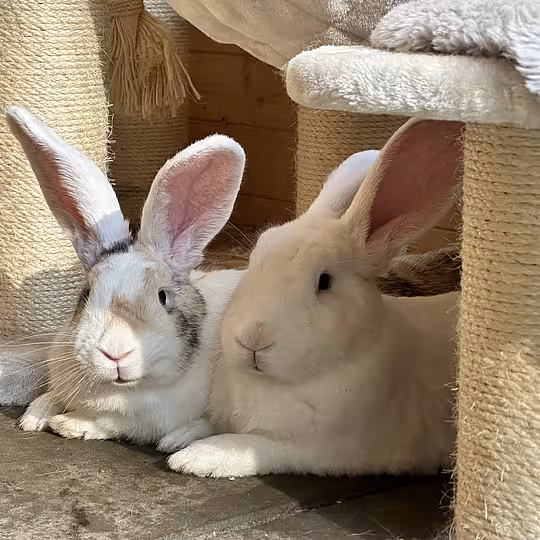 Beide sind sehr lieb, zutraulich und kommen sofort angehoppelt, sobald es Futter gibt. Sie sind an Menschen gewöhnt, mögen es jedoch nicht, hochgenommen zu werden.