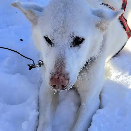 Seit 2022 lebt er bei uns im Rudel und ist auch gut am Schlitten gelaufen. Wir merken aber, dass er im Rudel zu viel Stress hat, und wir versuchen ihn, so gut es geht zu separieren. Aber auf Dauer ist das keine Lösung und Hakon braucht direktere Betreuung durch den Menschen.